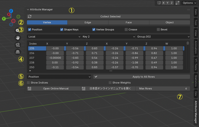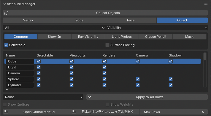 Attribute Manager は Blender のための強力なアドオンで、スプレッドシート形式で属性を一括編集するUIを提供します。Blenderのプロパティパネルをひとつひとつクリックして変更する代わりに、このアドオンを使うと効率的に属性値を確認・編集できます。