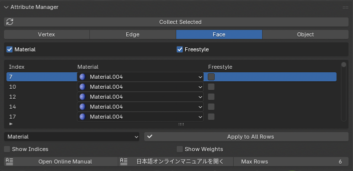 多くの面が同じマテリアルを共有する場合に一括編集が便利です。Freestyleの属性も変更可能です。