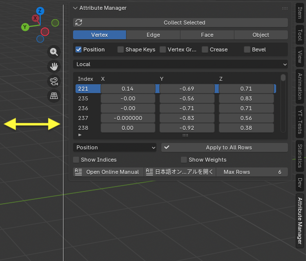 Attribute Manager は 3Dビューのサイドバー(Nパネル) に表示されます。AttributeManagerのパネルは水平方向に伸縮可能で、パネル左側のエッジをドラッグすることでパネルの幅を調整することができます。