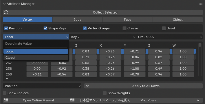座標値は ローカル / グローバル空間 の両方で表示できます。編集時は Blender 側に自動で変換されて反映されます。