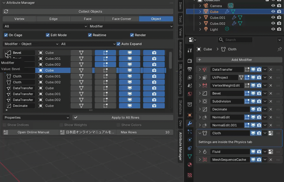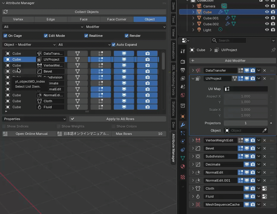 Also, if you set the item to Properties and execute Apply to All Rows, all properties of the modifier in the selected row will be copied to modifiers of the same type as the modifier in the selected row. This is useful when you want to set the same properties for all modifiers at once. Enabling Auto Expand will expand the properties panel for the modifier in the selected row and close all other panels.